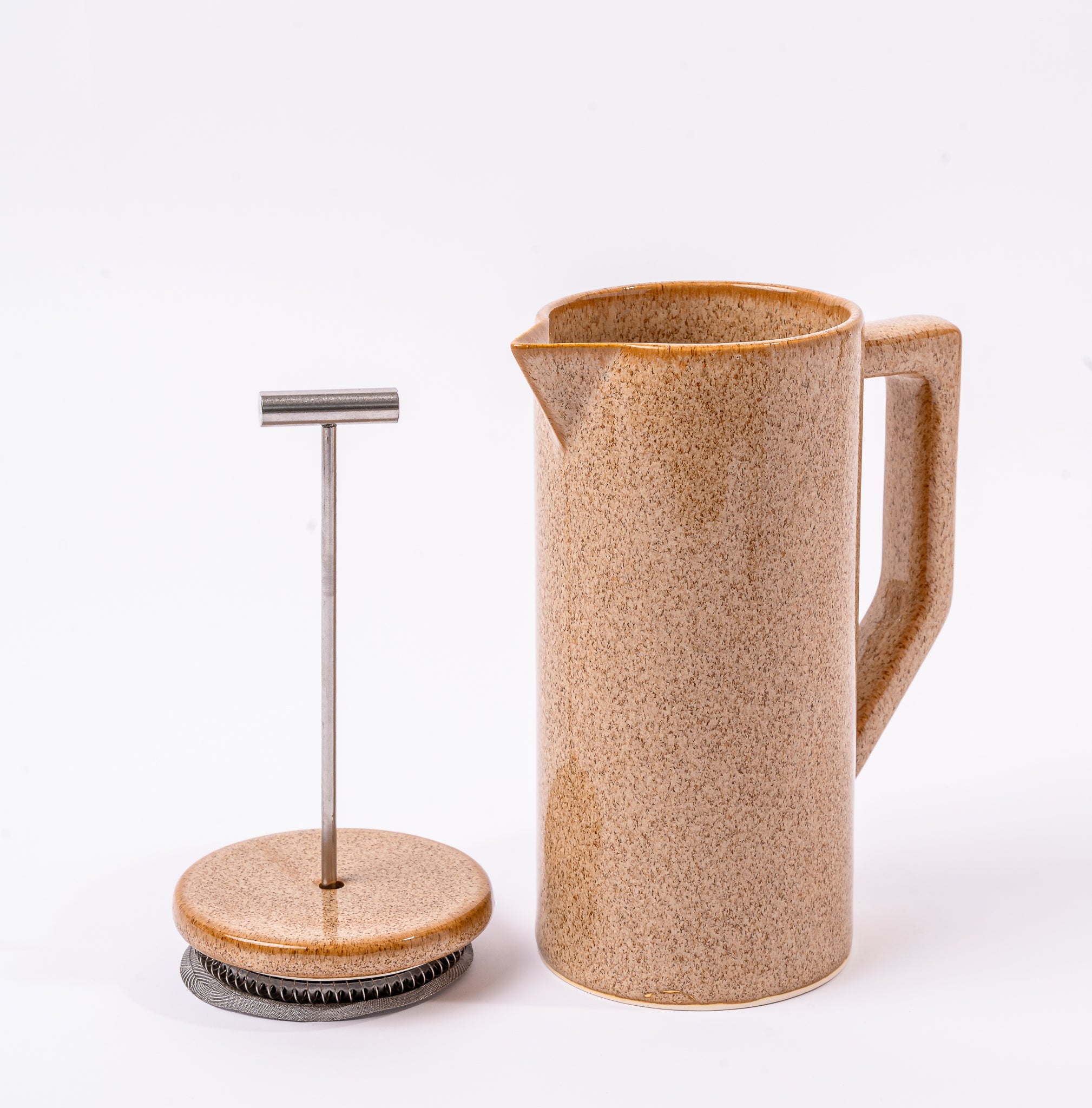 Elevate your morning ritual with refined elegance with the Sierra Java Collection. Handmade in Mexico from high-fired ceramic and finished in rich, earthy glazes, this striking French press reinterprets a classic silhouette with bold architectural lines and a modern handle. With a capacity of 27 fl oz, its ceramic structure retains heat beautifully, and its stainless steel plunger delivers a clean, full-bodied brew.