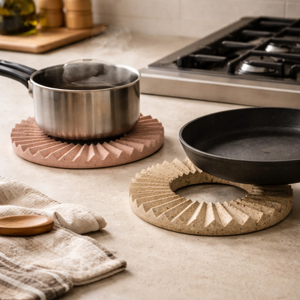 Sculptural and functional, the Duna Trivets protect your surfaces with style. Each piece features a rippling, dune-inspired pattern that adds warmth and texture to your table. Perfectly sized for hot pots, pans, or serving dishes, these durable trivets bring artistry and elegance to everyday dining and special gatherings.