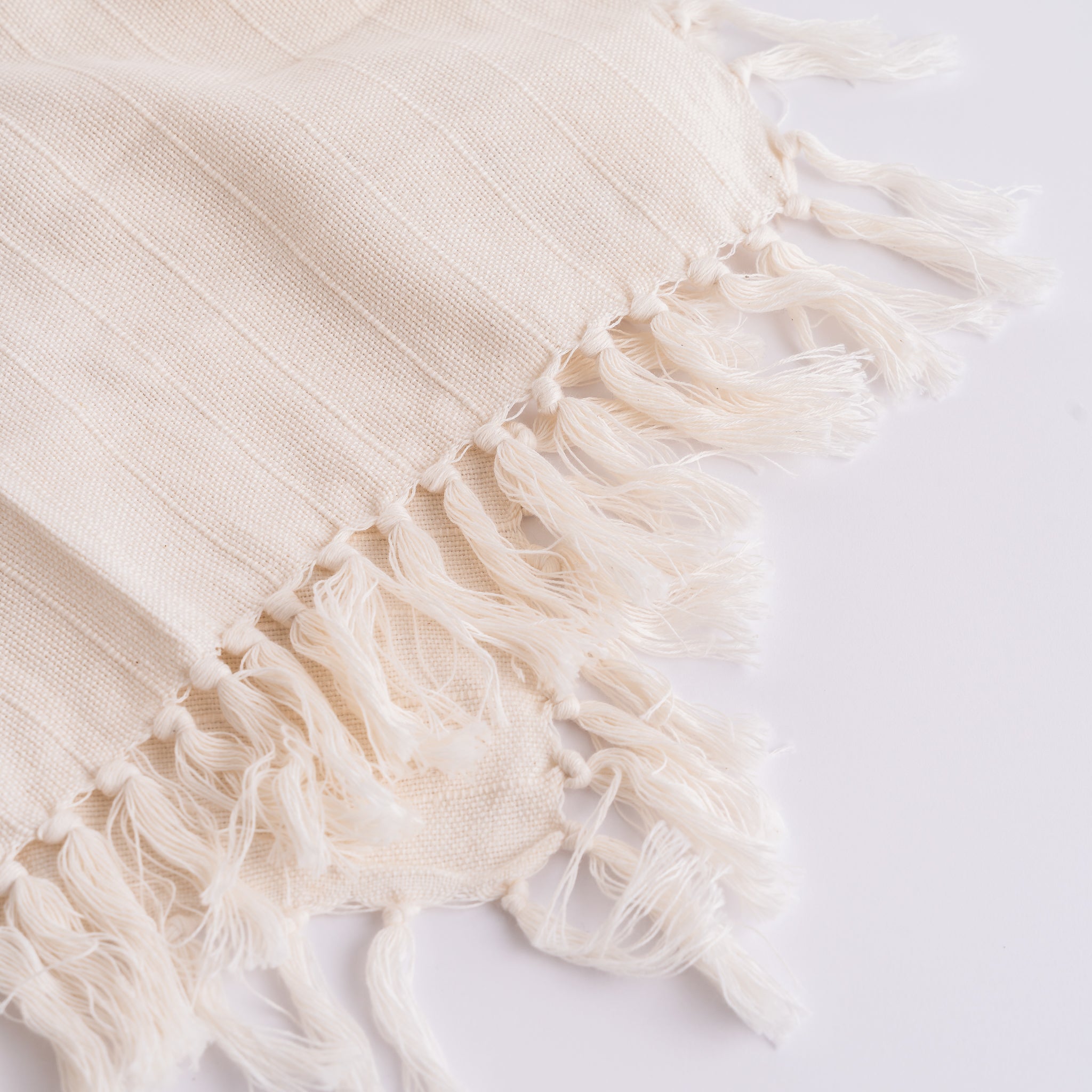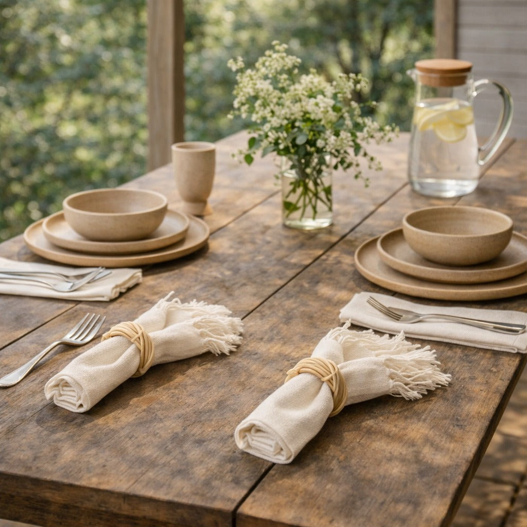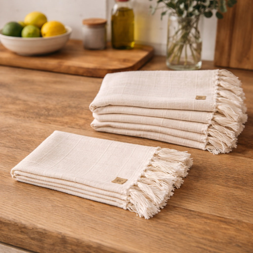 This set of two cotton napkins in a soft nude tone brings understated elegance to your table. Finished with delicate fringes along the border, each piece is loom-woven by Mexican artisans, showcasing their skill and creativity. Perfect for everyday dining or special entertaining, they add warmth, texture, and artisanal beauty to any table setting.