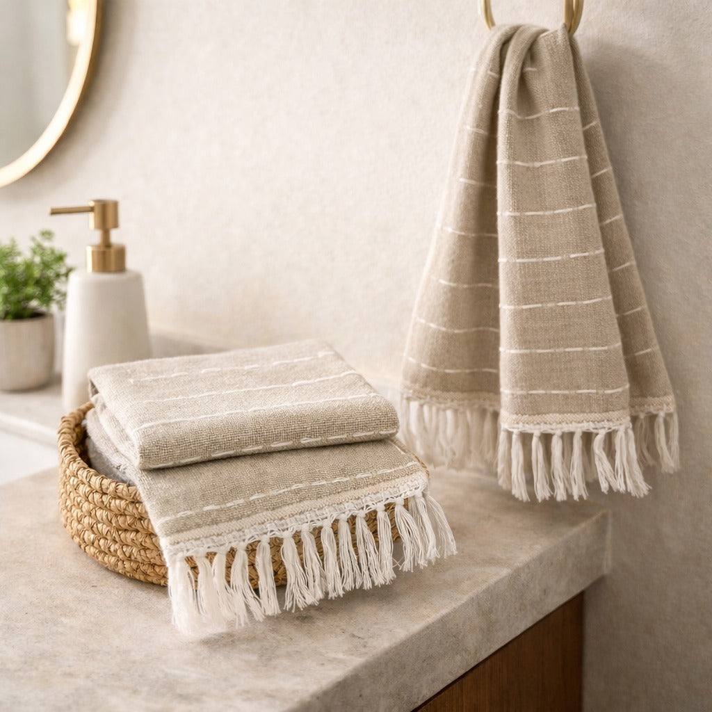 Woven from natural cotton on traditional looms, this hand towel brings artisanal beauty and everyday function to your home. Soft, absorbent, and gentle on the skin, it’s perfect for family or guest bathrooms as well as the kitchen. A versatile piece that blends practicality with quality craftsmanship.