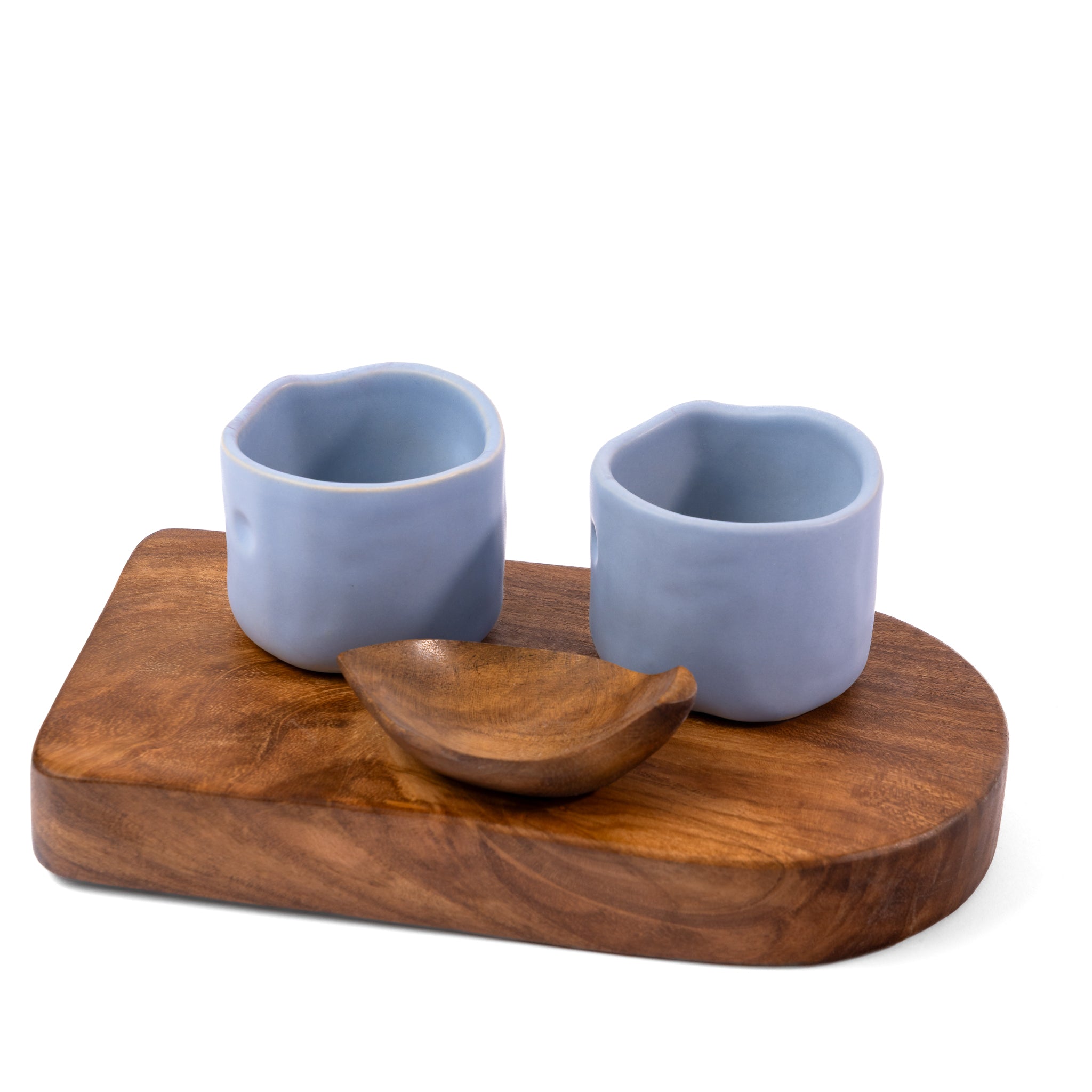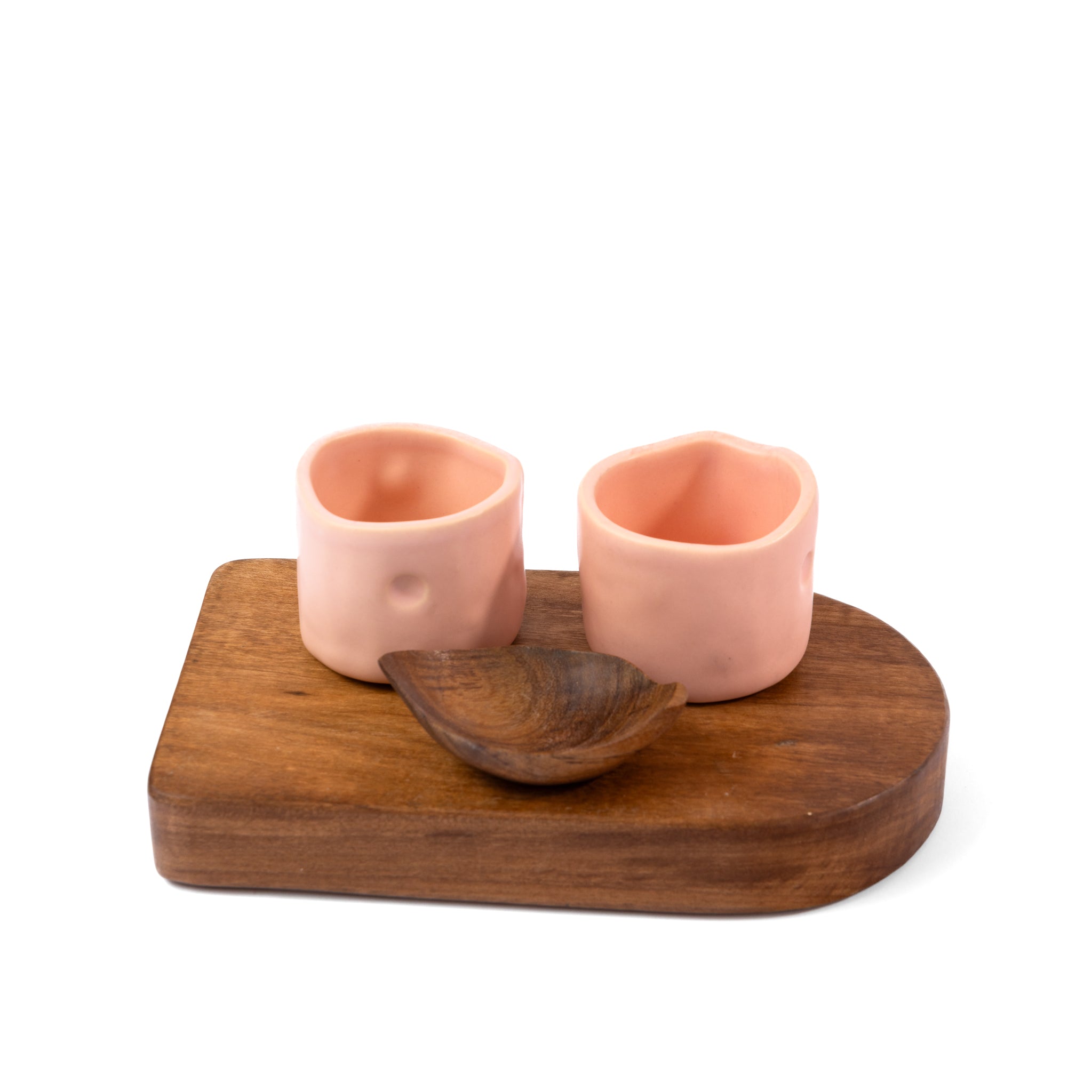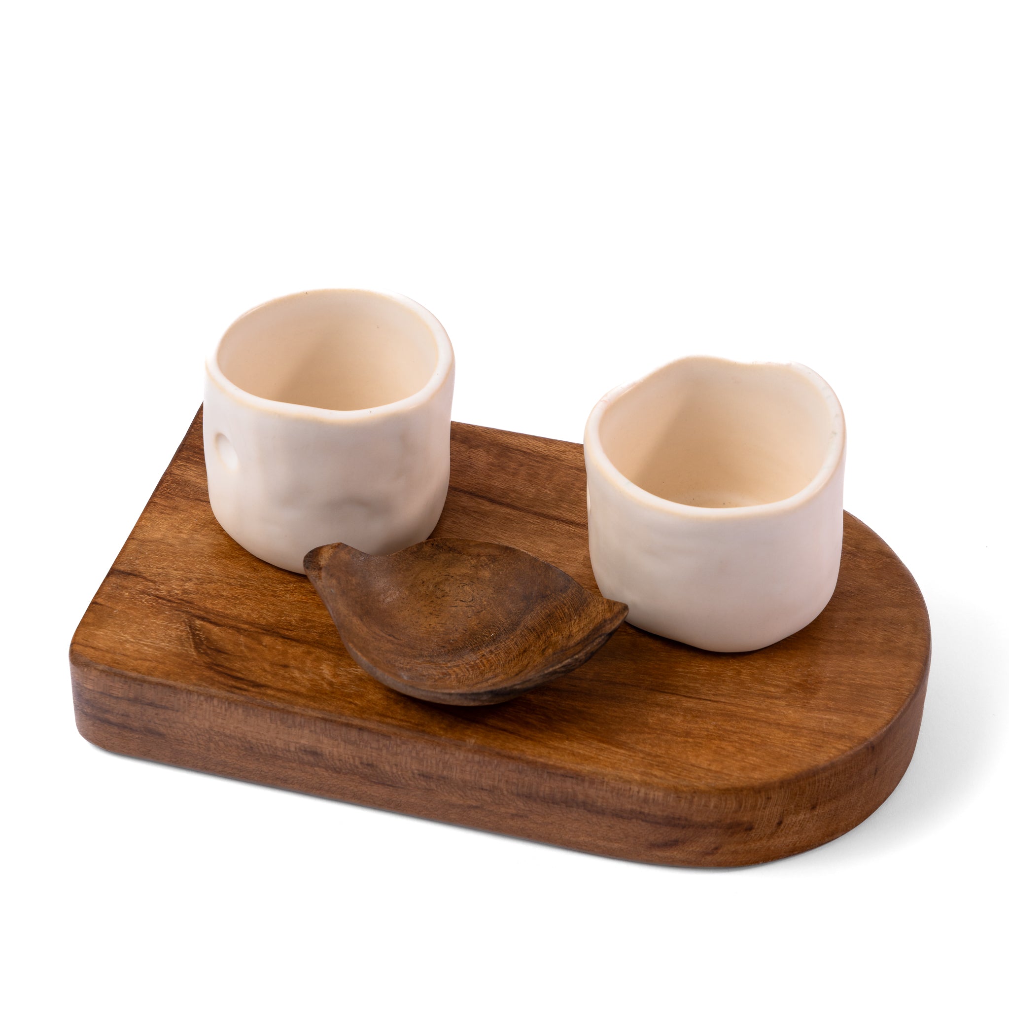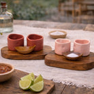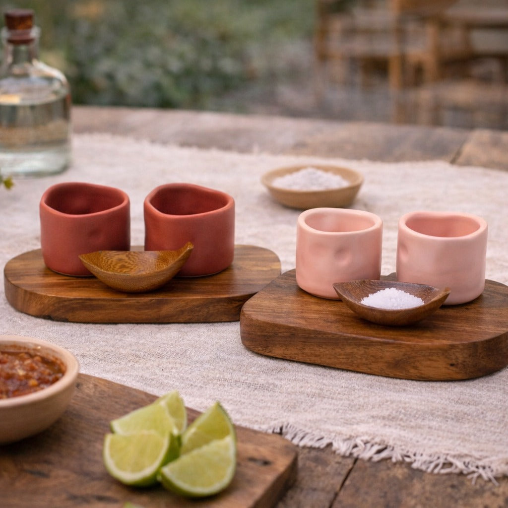 Rooted in tradition, the Raíz Set celebrates the art of mezcal. It features two handcrafted ceramic shot glasses and a richly grained parota wood base and leaf-shaped salt dish. Each piece showcases unique artisanal craftsmanship, turning every pour into a shared moment of connection.