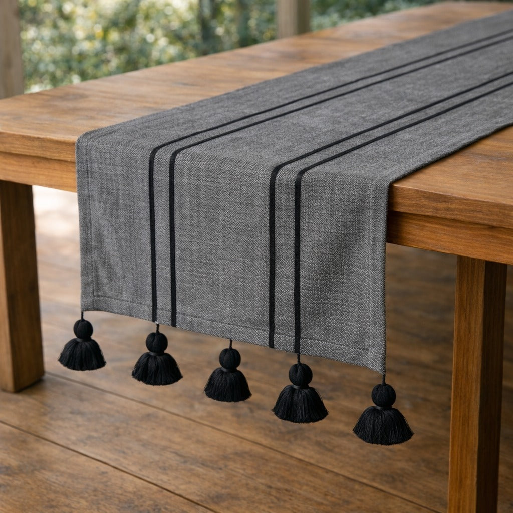 The Sombra Table Runner brings modern elegance to any table. Loom-woven in Mexico, its deep charcoal hue, textured weave, double stripes, and soft tassels create a sophisticated, timeless foundation for everyday meals or special gatherings.