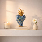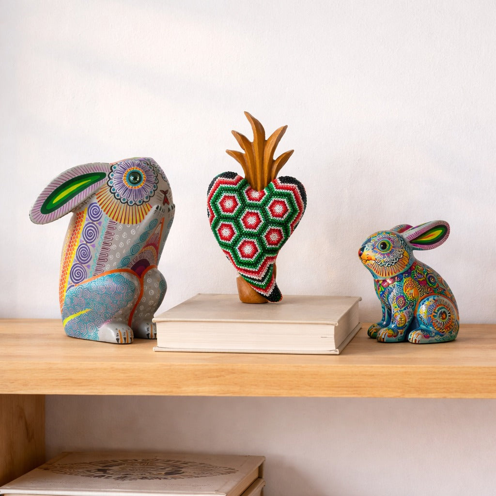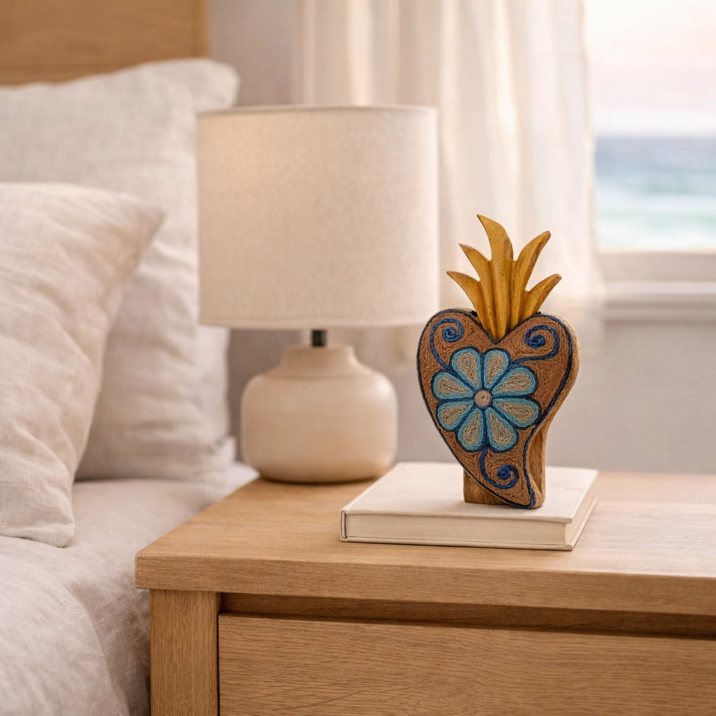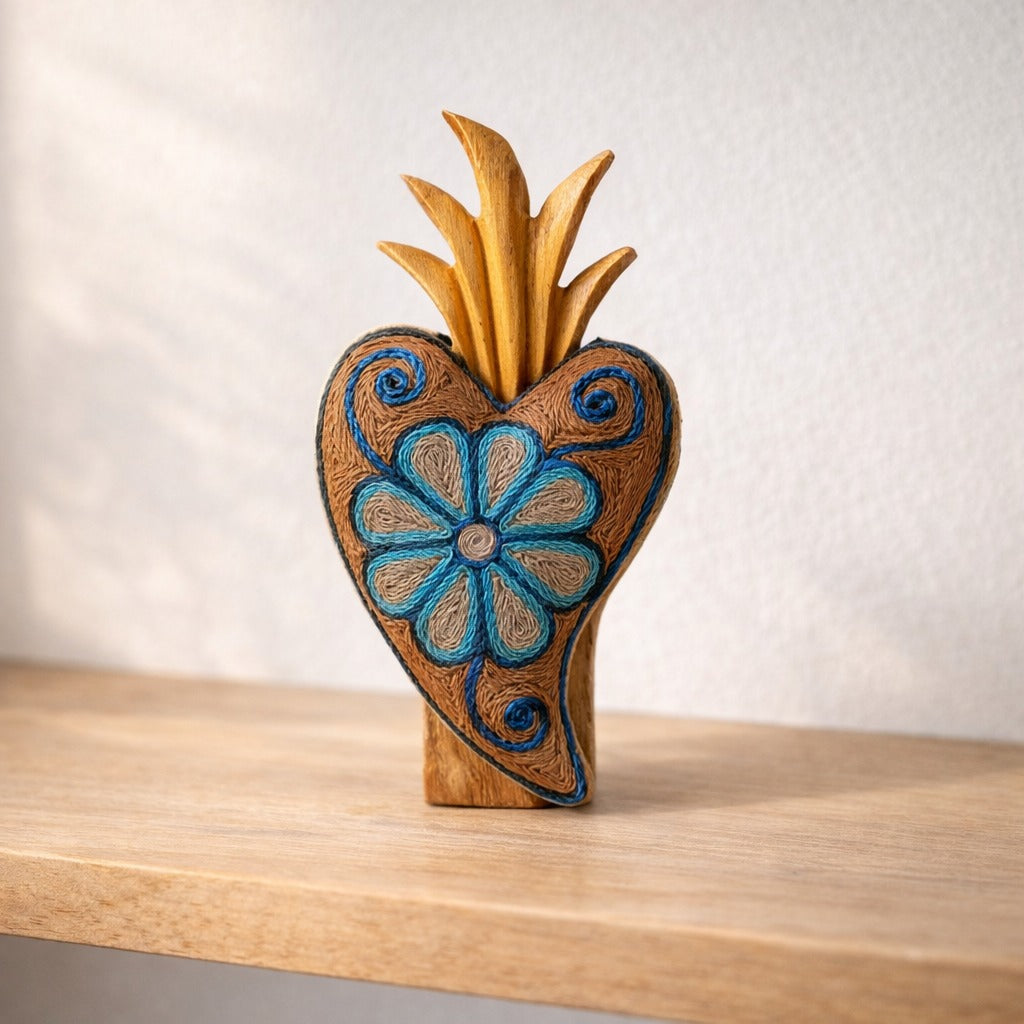 This heart sculpture celebrates Mexican artisanal mastery with a hand-carved wooden form and crowned top. Some feature meticulously hand-embroidered, naturally dyed threads, while others are adorned with vibrant chaquira beads in intricate patterns, making each piece a unique expression of artisan skill and creativity.