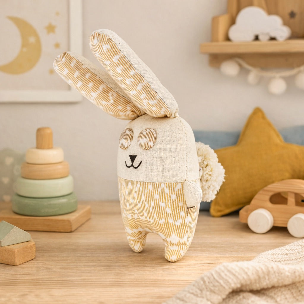 This adorable plush bunny is crafted from 100% handwoven cotton with a soft brushed cotton thread tail. Its charming artisanal design and decorative patterns make it a favorite for babies and toddlers, perfect as a thoughtful baby shower or birthday gift.