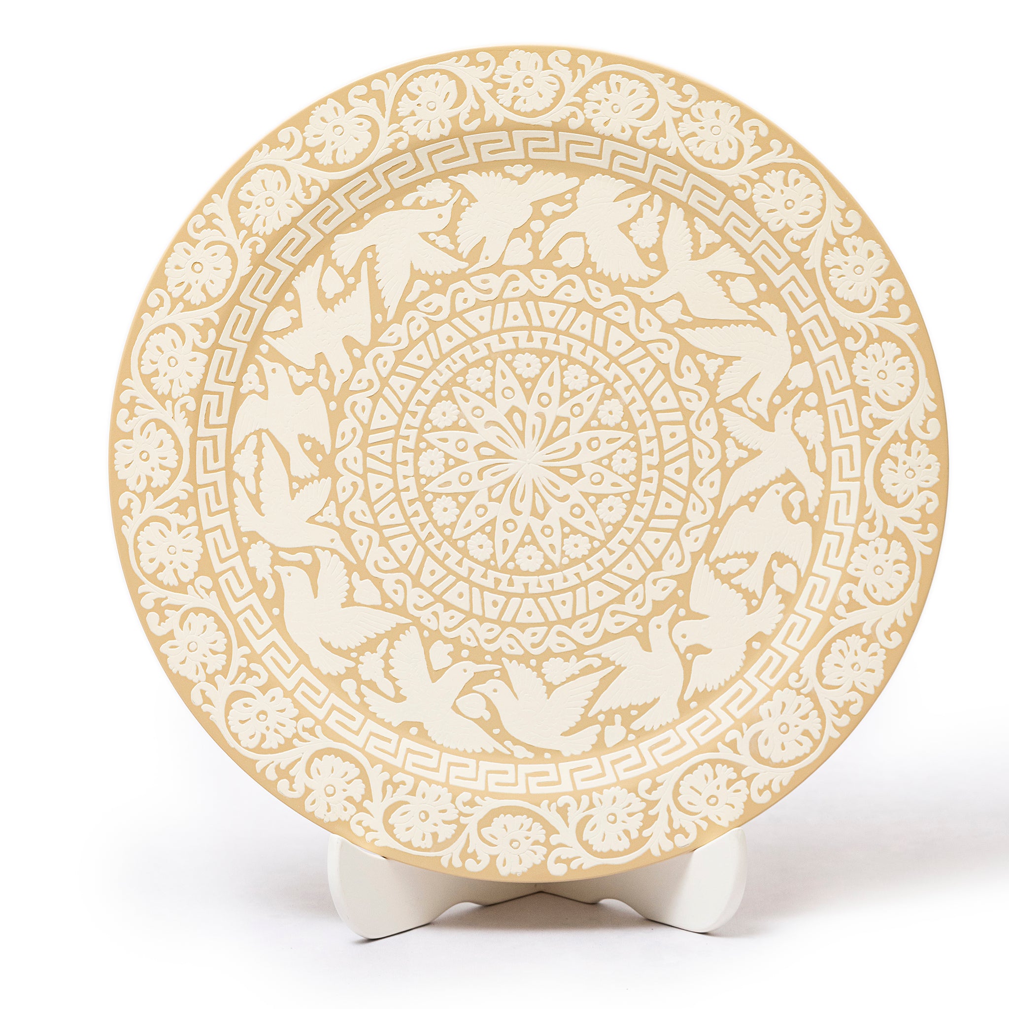 This decorative wooden plate brings timeless elegance and artisanal tradition to your home. Its intricate motif, etched and hand-painted in soft beige and ivory, celebrates harmony and Mexican Olinalá craftsmanship. Displayed as a standalone statement or within a curated collection, its neutral palette adds graceful, grounded beauty to any space.