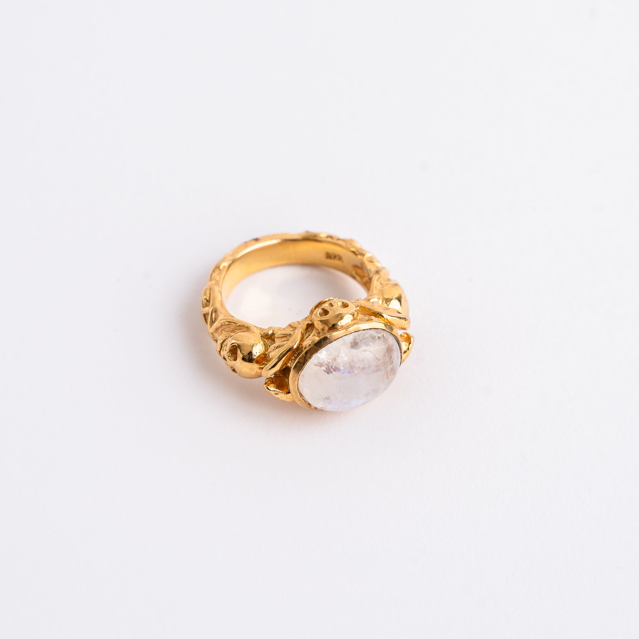 A striking gold-plated ring featuring a fully textured band adorned with small skull motifs, topped with a natural iridescent stone that evokes the luminous presence of a full moon. Bold yet refined, this piece showcases exceptional artisanal craftsmanship and makes a distinctive statement. Size 6