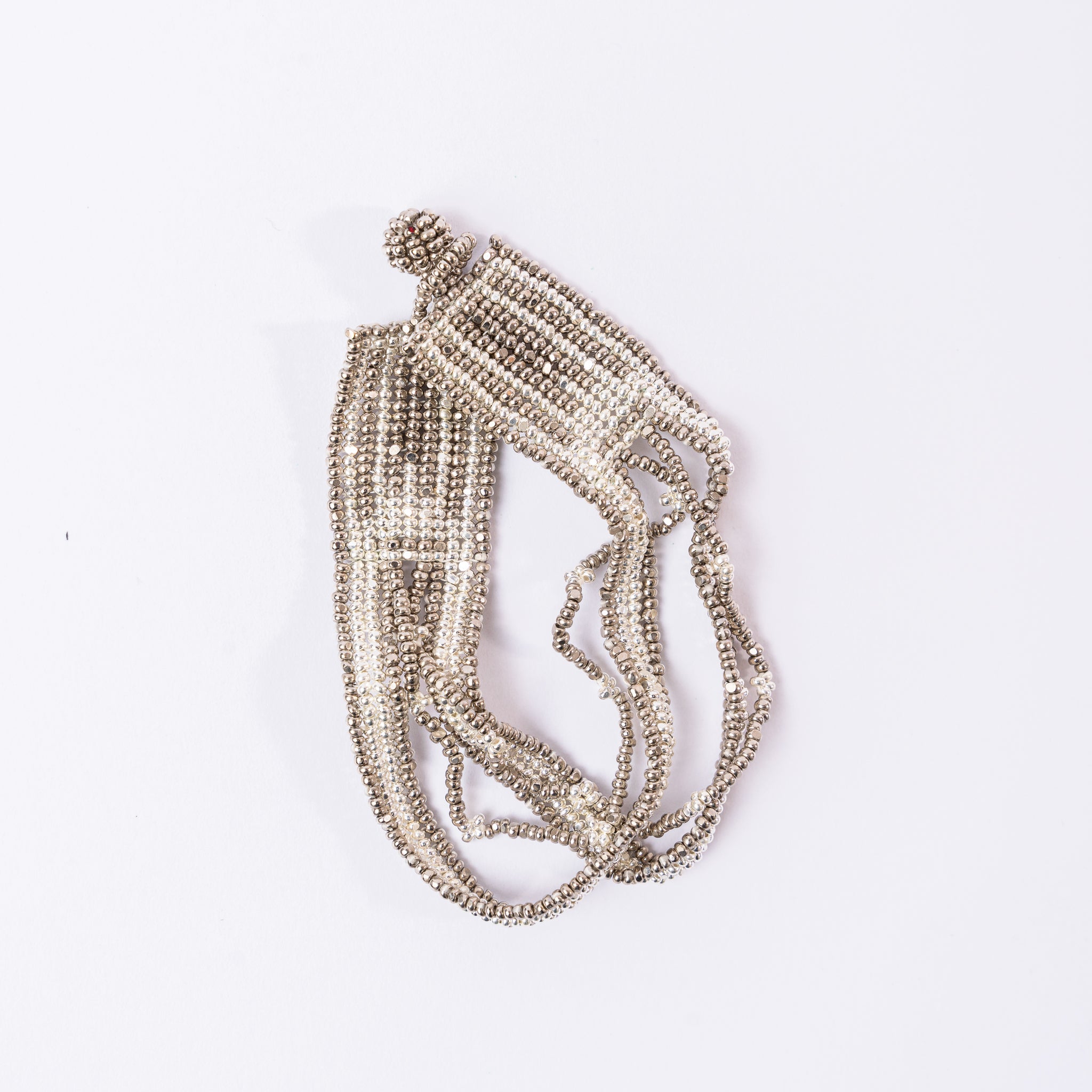Flawless execution and expert craftsmanship define this two-toned silver bead bracelet. Featuring a bold, thick end and delicate single strands in the middle, it moves gracefully and draws attention as a magnificent artisanal statement piece.