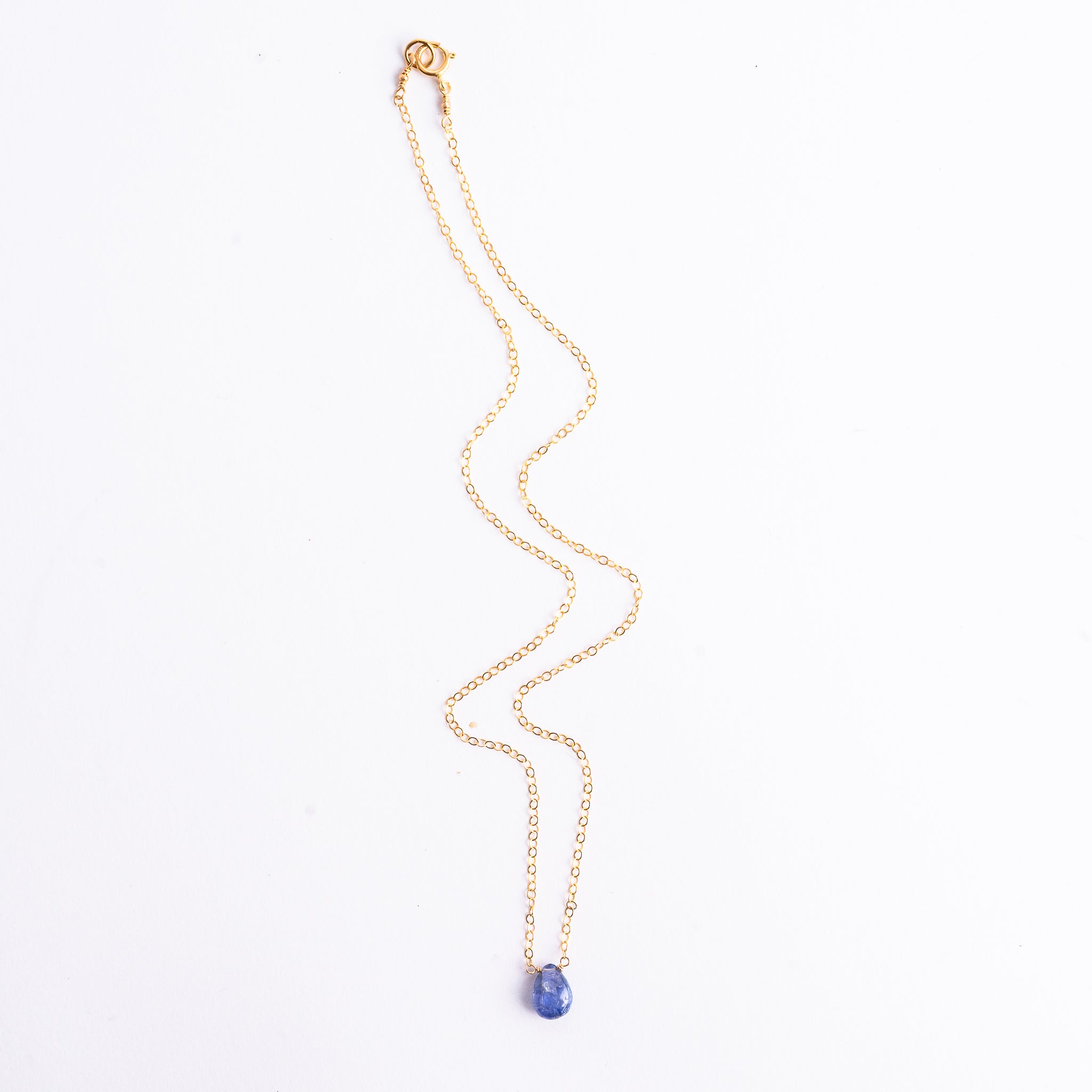 This long gold chain showcases a natural tanzanite pendant, suspended like a luminous water drop. Revered for its connection to transformation, spiritual growth, and intuition, the stone is expertly set by skilled artisans, giving the piece an ethereal elegance that elevates any ensemble.