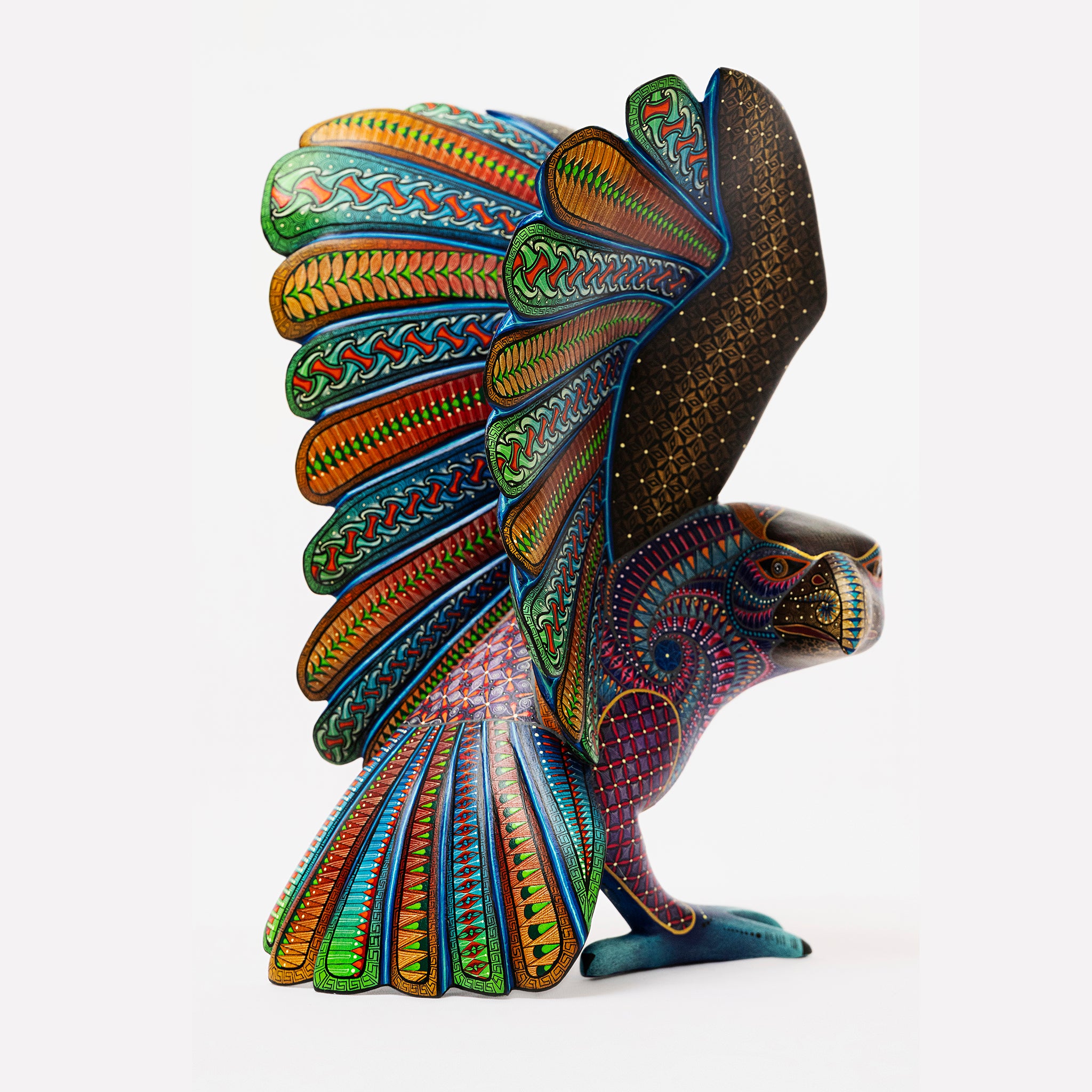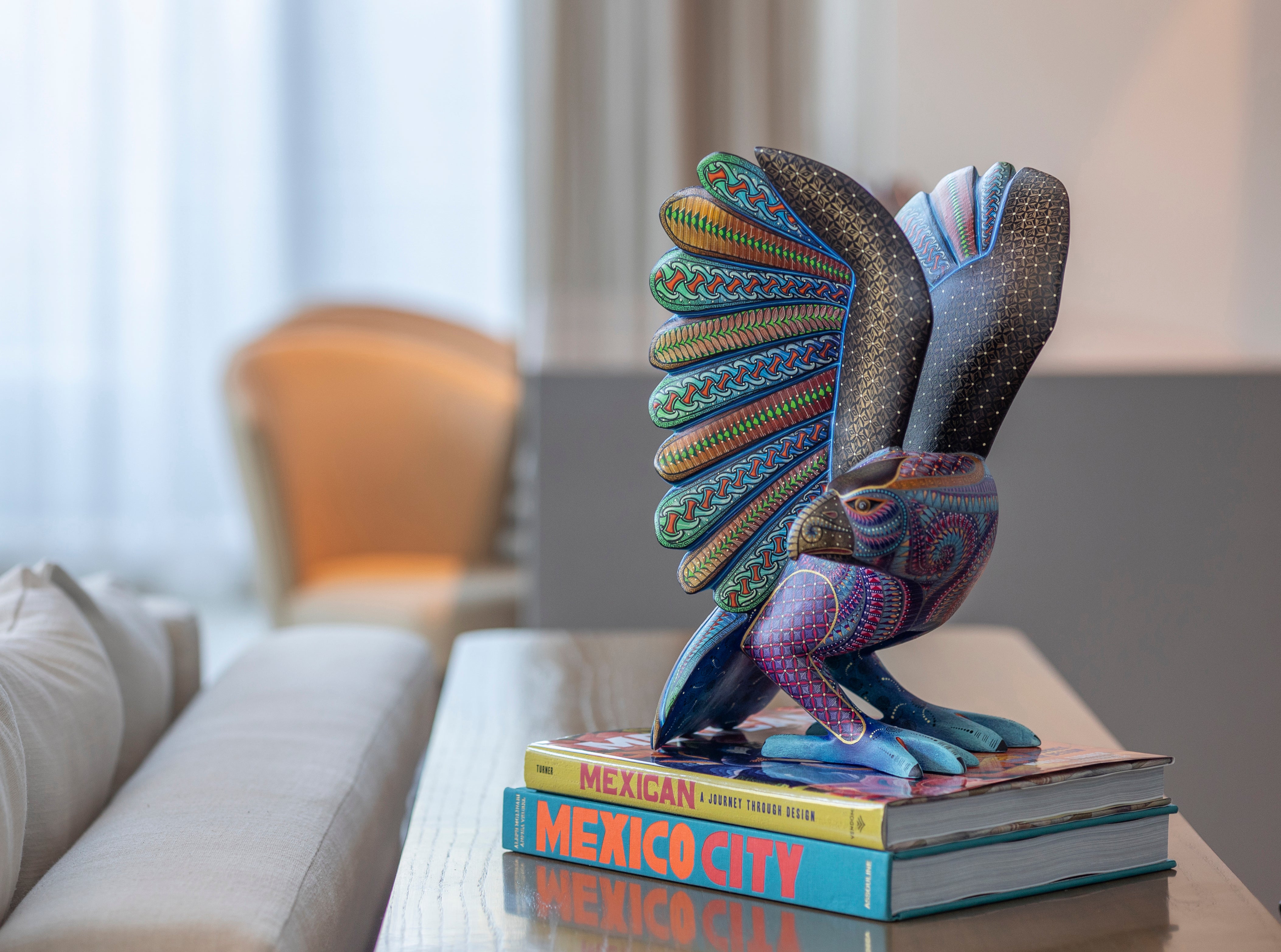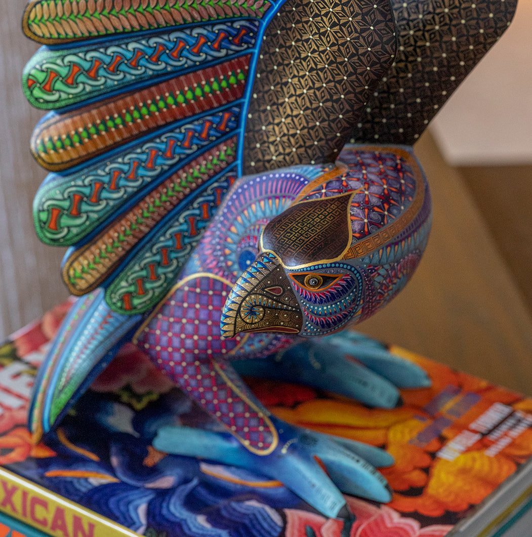 Hand-carved in Oaxaca and meticulously painted by skilled artisans, Águila Real captures the majestic spirit of Mexico’s iconic eagle. This striking alebrije showcases intricate Zapotec-inspired patterns in vibrant, iridescent hues, symbolizing strength, freedom, and cultural heritage. Each piece is one-of-a-kind, celebrating the craftsmanship and storytelling rooted in Mexican folk art.