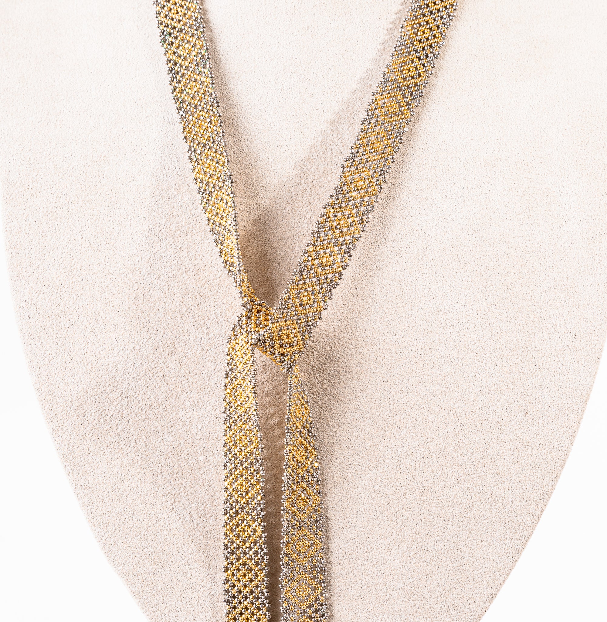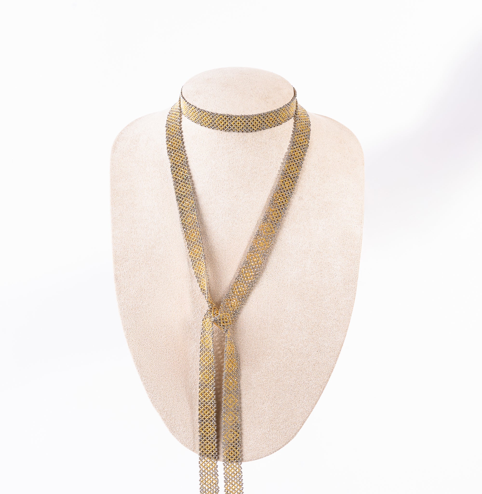 This stunning artisanal necklace features a long, ribbon-like strand woven from gold and silver beads, finished with delicate fringe at each end. Designed to be wrapped and tied in multiple ways, it offers versatile styling to complement any outfit. A timeless piece crafted with exceptional skill by talented Mexican artisans.